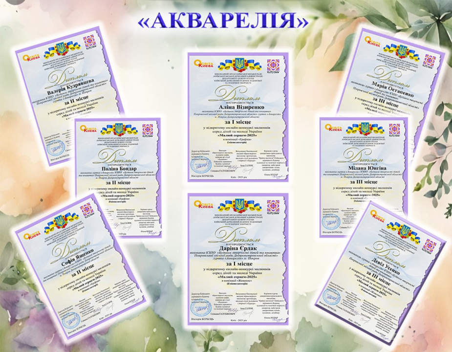 Яскраві успіхи продемонстрували й вихованці гуртка «Акварелія» (керівник Діана Спіркова). Перші місця посіли Аліна Візиренко та Даріна Єрдак. Друге місце розділили Софія Ященко, Поліна Бондар і Валерія Кудрявцева. Третє місце вибороли Девід Усенко, Мілана Юнгіна та Марія Остапенко.