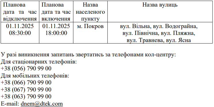 З метою підвищення надійності електропостачання та попередження аварій в електричних мережах АТ «ДТЕК Дніпровські електромережі» 01.11.2025 р проводитимуться профілактичні роботи в межах Покровської міської територіальної громади: