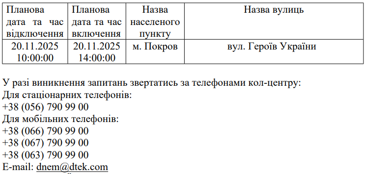 З метою підвищення надійності електропостачання та попередження аварій в електричних мережах АТ «ДТЕК Дніпровські електромережі» , 20.11.2025р проводитимуться профілактичні роботи в межах Покровської міської територіальної громади: