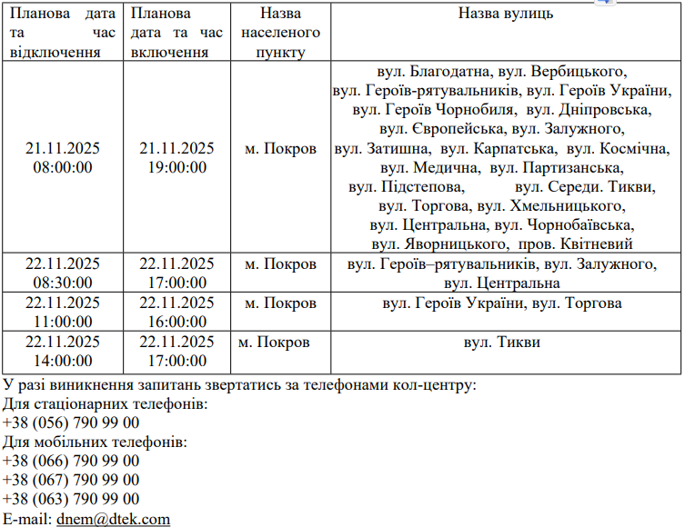 З метою підвищення надійності електропостачання та попередження аварій в електричних мережах АТ «ДТЕК Дніпровські електромережі» 21.11.2025, 22.11.2025р проводитимуться профілактичні роботи в межах Покровської міської територіальної громади: