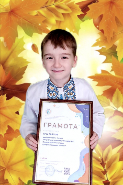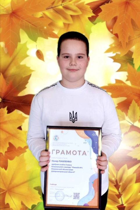 Вітаємо учнів 3 класу Єгора Габітова (робота «Їжачок-мастачок») та Назара Павленка (творча композиція «Осінні дари»). А також восьмикласницю Софію Вороніну (витинанка “Панночка осінь”). Їхні творчі роботи наповнені теплом, затишком і щирістю. Дітей підтримували у творчості педагоги Галина Войтенко, Наталія Лекомцева та Ганна Дзюба.