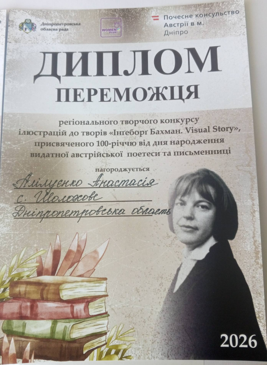 Вже не вперше талановиті діти Покрова стають лауреатами конкурсів, організованих Почесним консульством Австрійської Республіки у місті Дніпро. Цього разу одразу дві перемоги здобули вихованки Тетяни Алілуєнко, Будинку культури Шолохового. Марія Сольська та Анастасія Алілуєнко розкрили у своїх роботах творчість австрійської поетеси та письменниці Інґеборґ Бахман, вразивши журі глибиною та розумінням поданого матеріалу.