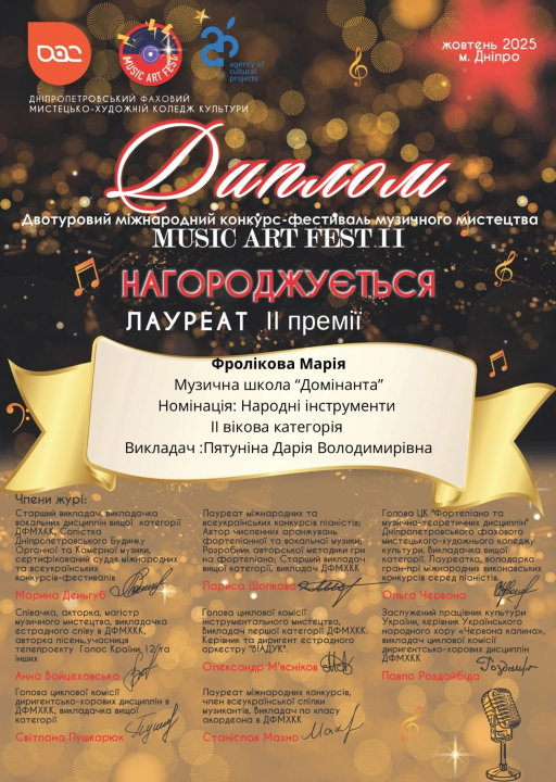 Дипломи Лауреата ІІ ступеня отримали: Сергій Ліщинський - номінація «Гітара» (викладач Юлія Журавель), Нікіта Михайлов - номінація «Гітара» (викладач Галина Торукало), Олександр Волков - номінація «Баян» (викладач Наталія Терьохіна), Властеліна Новохатня - номінація «Бандура» (викладач Галина Торукало).