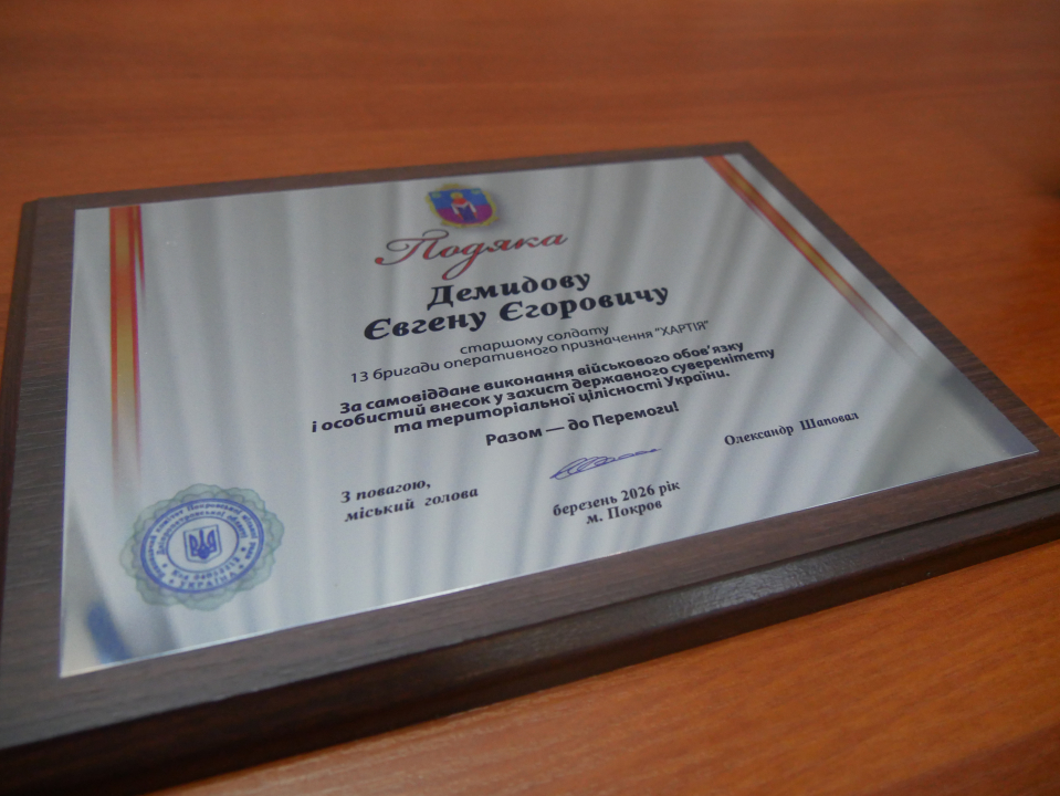 На сесії розглянули ряд важливих питань згідно порядку денного. У ході засідання було зазначено, що на адресу Покровської міської територіальної громади надійшов лист-відзнака від командування бригади оперативного призначення «Хартія» військовослужбовцю, покровчанину Євгену Демидову. Олександр Шаповал вручив Подяку дружині Євгена Демидова, старшого солдата бригади оперативного призначення “ХАРТІЯ”, за самовіддане виконання військового обов’язку і особистий внесок у захист державного суверенітету та територіальної цілісності України.