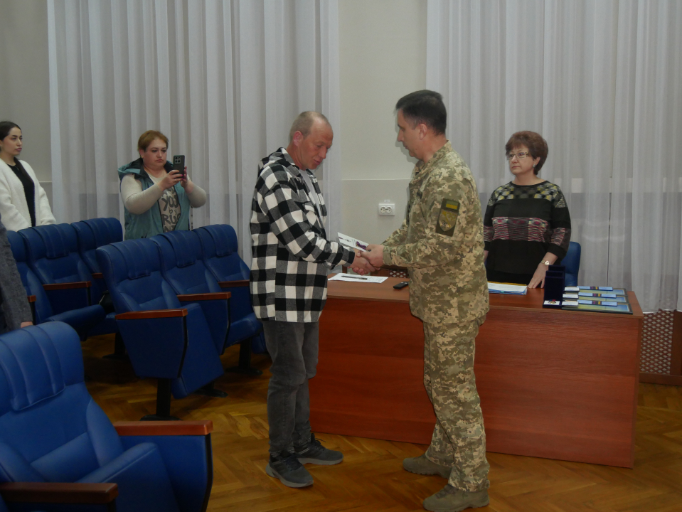 Офіцер третього відділу у місті Покров Нікопольського районного територіального центру комплектування та соціальної підтримки капітан Анатолій Пастух вручив Захиснику України, солдату Олегу Сувиду відзнаку Головнокомандувача Збройних Сил України «За незламність».