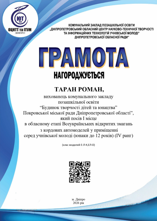 На обласному етапі Всеукраїнських відкритих змагань з кордових автомоделей у приміщенні серед учнівської молоді (юнаки до 12 років, IV ранг) наші спортсмени вибороли перші місця у своїх категоріях. Переможцями стали Роман Таран та Макар Лобунець, які здобули «золото» у класах ЕЛ-О та ЕЛ-К. Упевнено рухатися до нових звершень їм допомагає керівник гуртка Володимир Томілов.