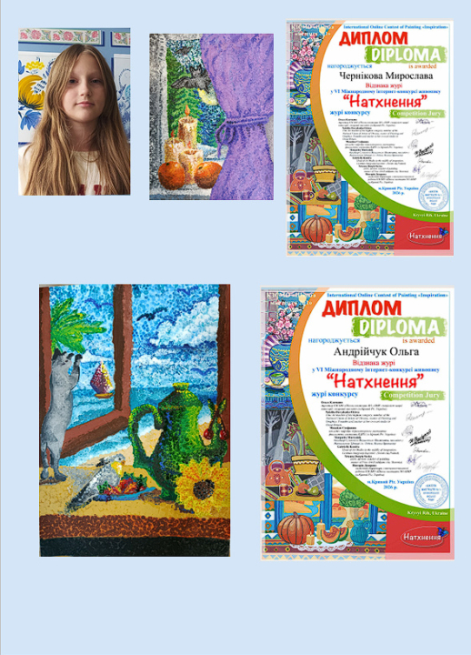 Перемогли вихованці Тетяни Думчикової та Тетяни Дмитрук і у шостому Міжнародному інтернет-конкурсі живопису «Натхнення». Диплом другого ступеня отримала Анна Таран, третього – Діана Постольник. Відзнаку журі – Мирослава Чернікова та Ольга Андрійчук. Дипломи за участь: Аміна Юзькова, Єва Чуніс, Мирослава Чернікова, Марія Хижняк, Софія Тодор, Анна Таран, Аліна Сокур, Анна-Марія Рубаха, Катерина Ричкова, Софія Рачук, Діана Постольник, Валерія Кудрявцева, Анастасія Бульба, Ольга Андрійчук.