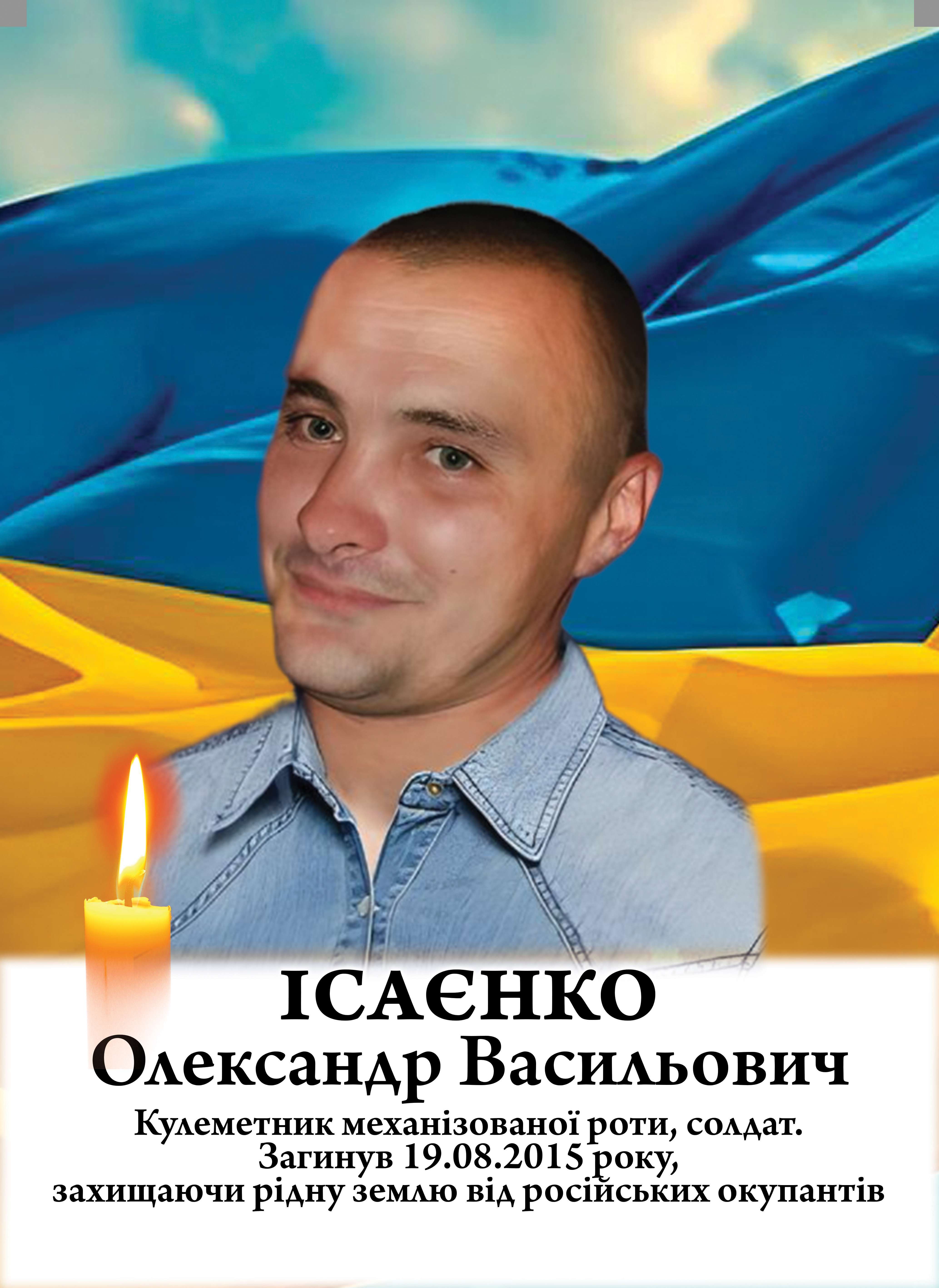 Олександр Ісаєнко загинув під час виконання бойового завдання, підірвавшись на протипіхотній міні. Його серце перестало битися 19 серпня 2015 року. Воїну було лише 34 роки, в нього залишилися мати, сестра, племінниці.