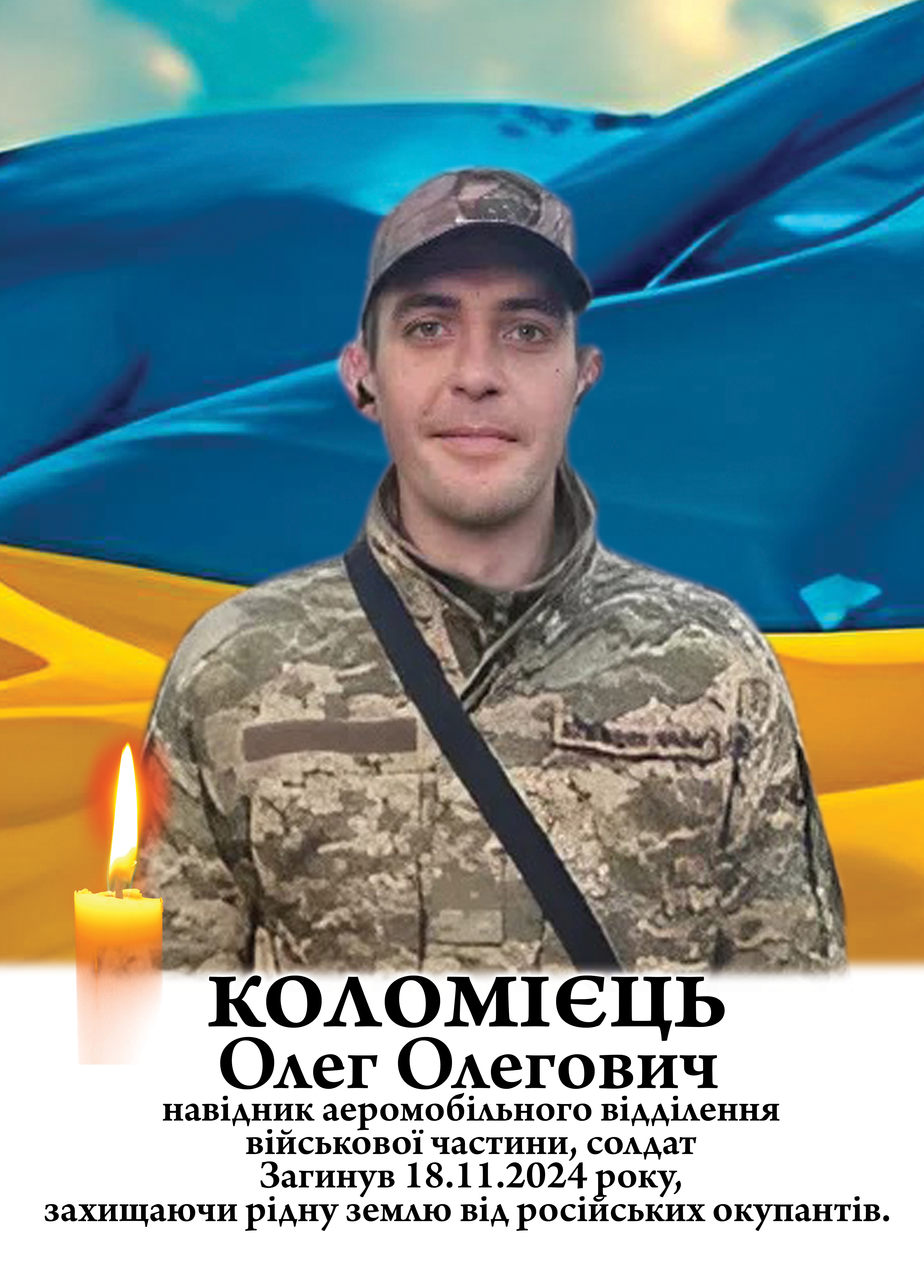 18 листопада 2024 року Олег Коломієць загинув, виконуючи бойове завдання в районі населеного пункту Кругляківка Харківської області, виявивши мужність, стійкість та відданість присязі. Йому було 37 років. У захисника залишилися батьки та сестра.