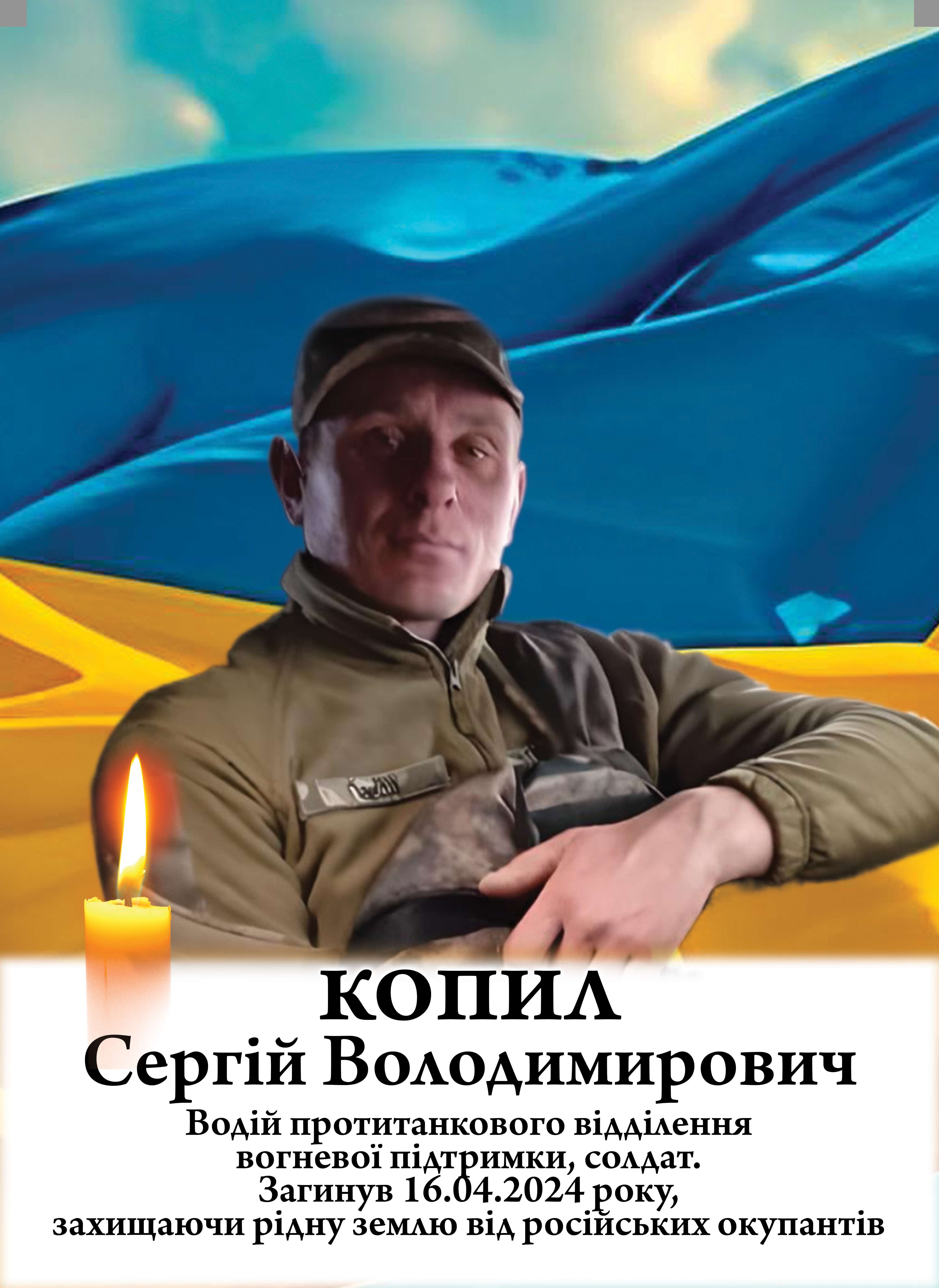 16 квітня 2024 року Сергій Копил загинув під час масованого артилерійського обстрілу біля Красногорівки, що на Донеччині, виконуючи бойове завдання, виявивши мужність, стійкість і відданість присязі.
