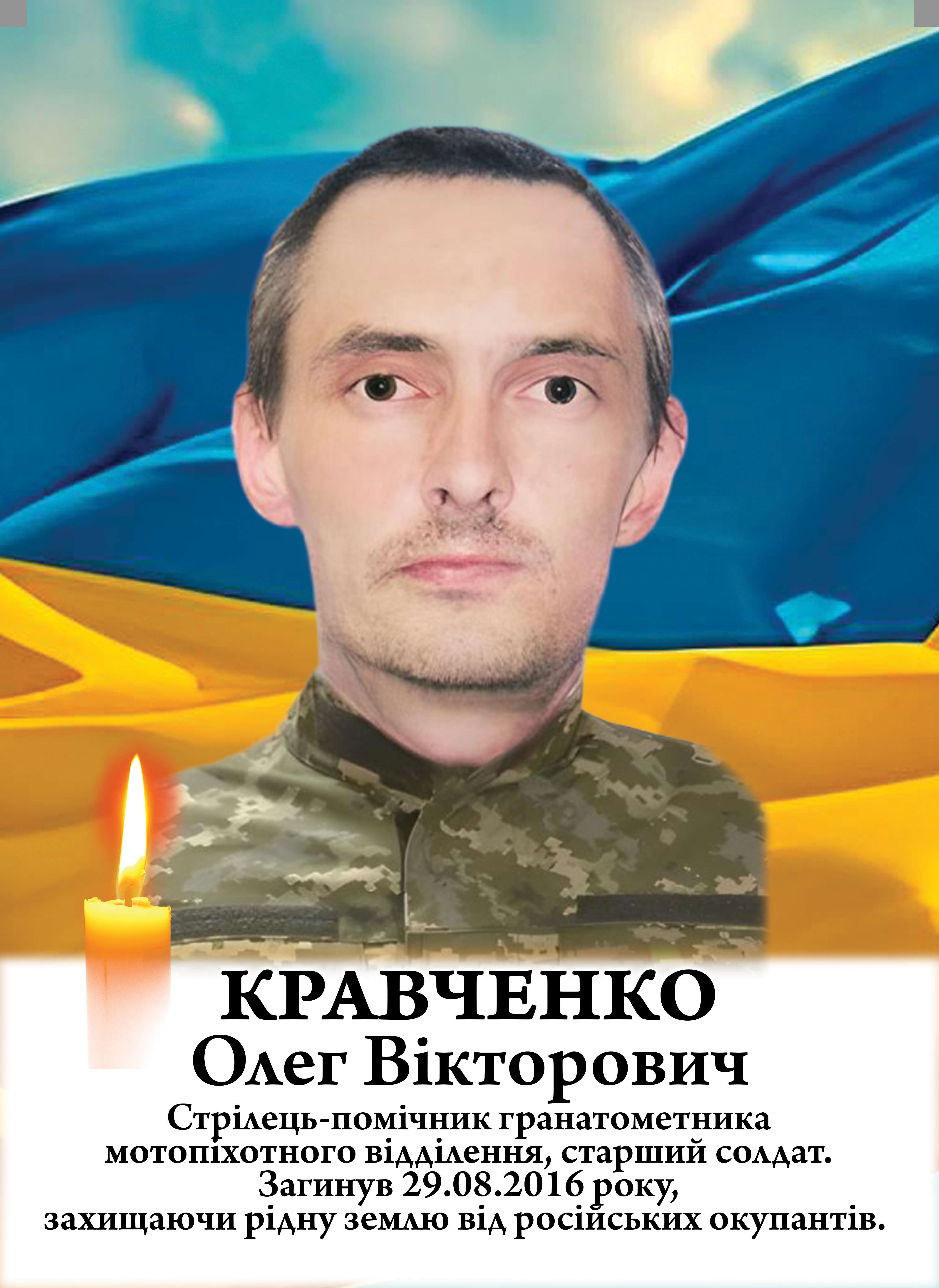 Олег Кравченко загинув 29 серпня 2016 року під мінометним вогнем біля села Павлопіль Волноваського району, врятувавши життя двох своїх товаришів. Йому було 40 років. У воїна залишилися дружина й син.