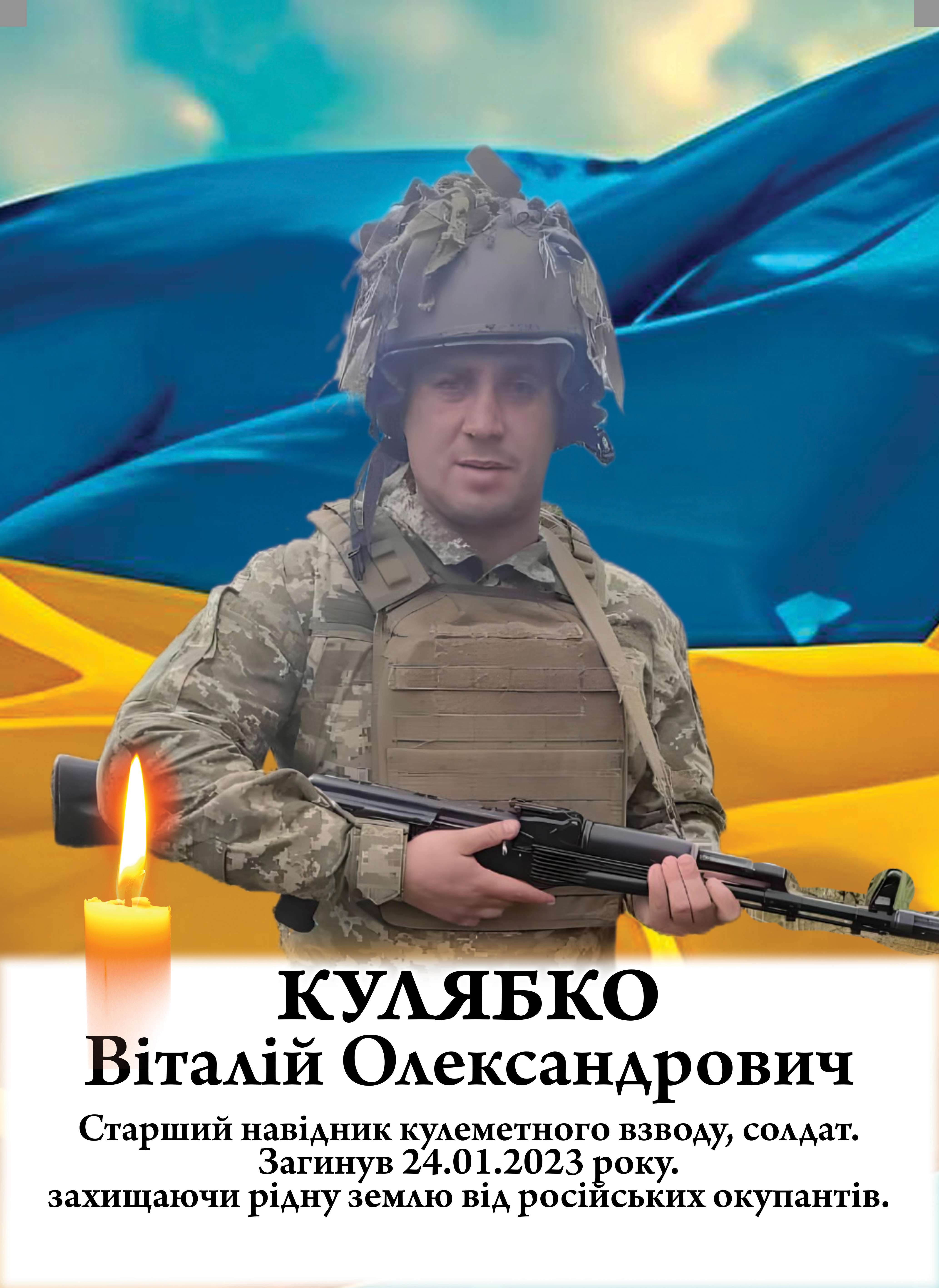 Віталій Кулябко загинув 24 січня 2023 року на Донеччині, в районі Мар’їнки, при виконанні бойового завдання, виявивши мужність, стійкість і відданість присязі. Захиснику було 34 роки, в нього залишилися маленька донечка, дружина, батьки, брат.