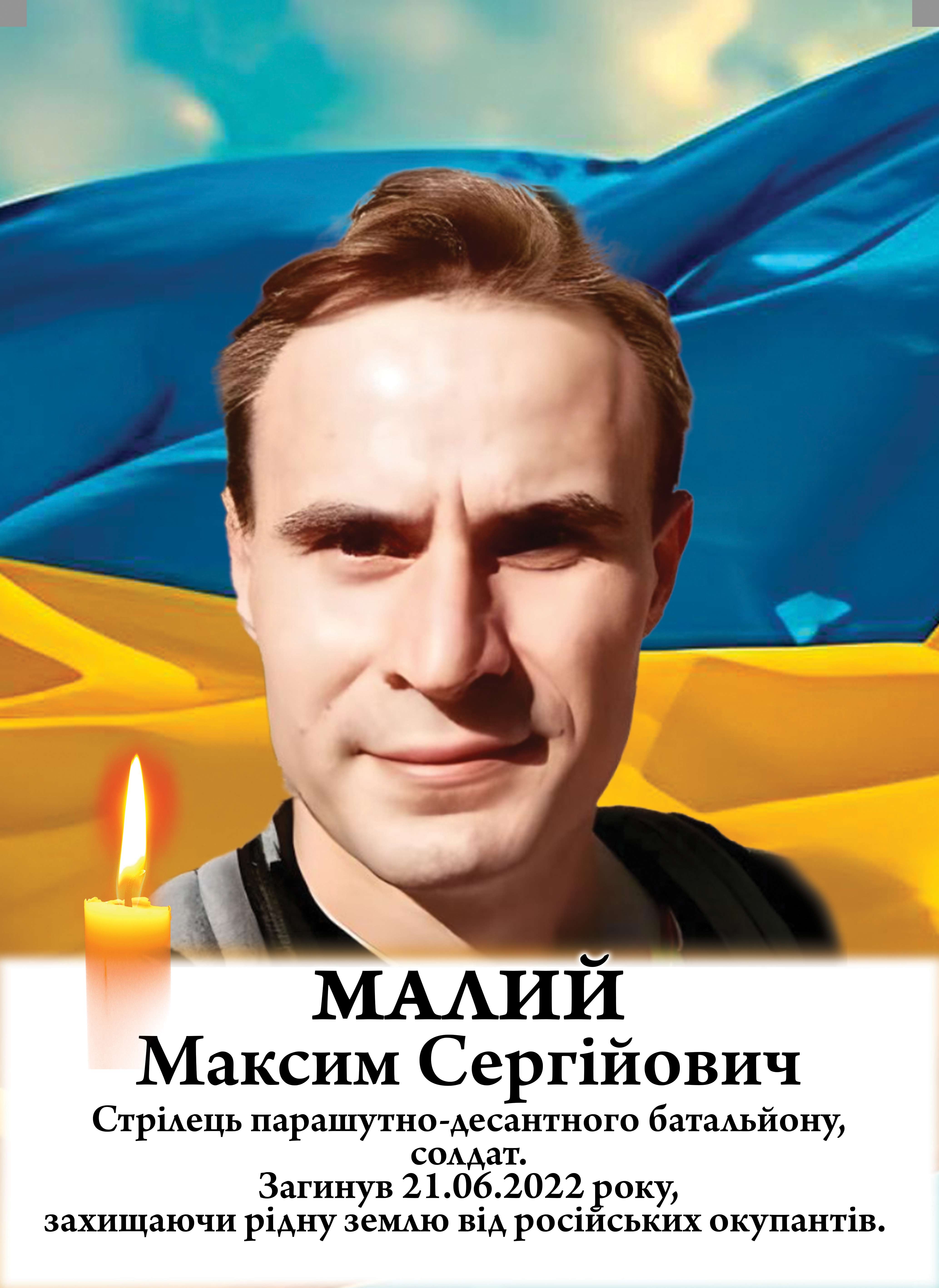 Максим Малий загинув 21 червня 2022 року поблизу села Мазанівка, що на Донеччині, виявивши мужність, стійкість та відданість присязі. Йому було 27 років…Він залишився у пам’яті як чесний, відкритий, щирий, готовий прийти на допомогу, як людина, яка прагнула миру та процвітання Україні.
