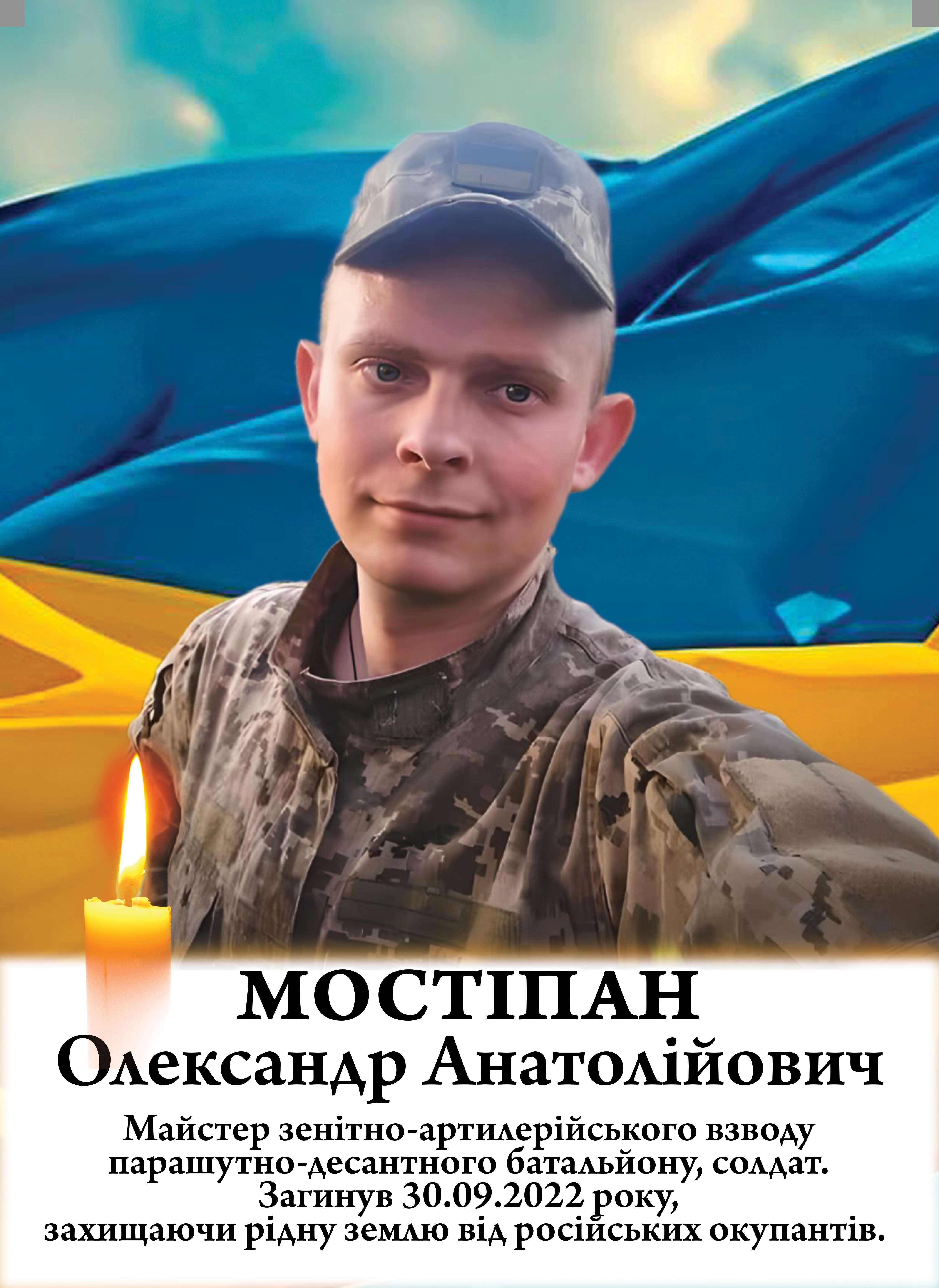 Солдат Олександр Мостіпан загинув 30 вересня 2022 року поблизу населеного пункту Нове Краматорського району Донецької області, виявивши мужність, стійкість і відданість присязі. Герою було 29 років. В нього залишилася мама, син і дружина.
