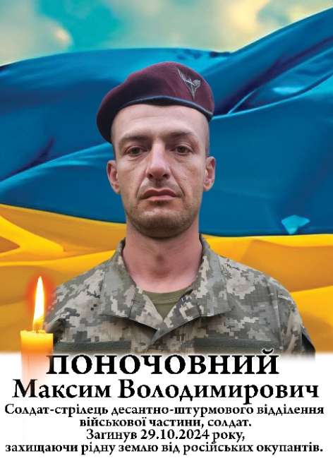 29 жовтня 2024 року Максим Поночовний загинув під час штурмових дій ворога поблизу населеного пункту Погребки на Курщині, виявивши мужність, стійкість і відданість присязі. Йому було 36 років.