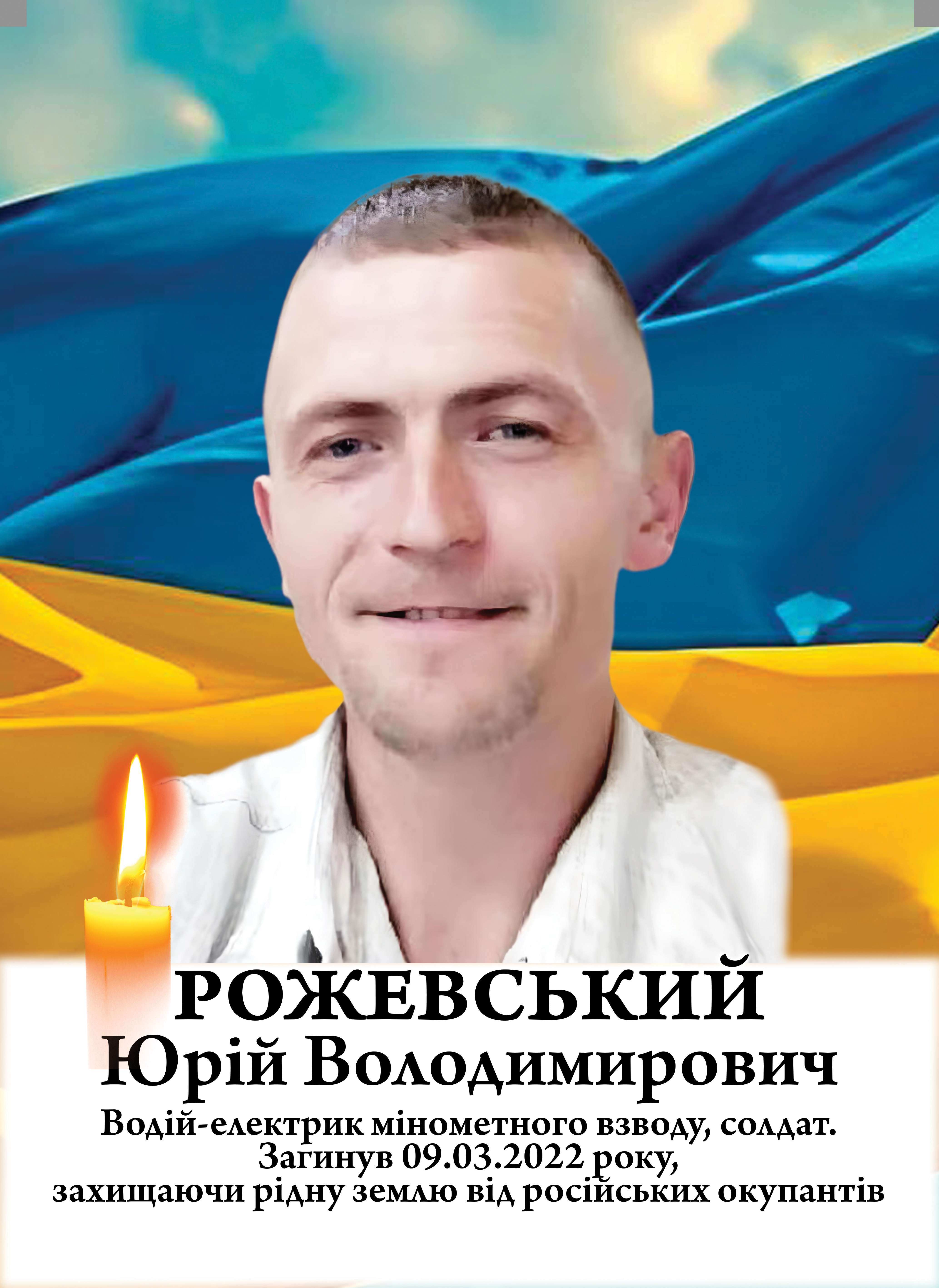 Юрій Рожевський загинув 9 березня 2022 року у бою біля населеного пункту Волноваха на Донеччині, захищаючи Україну, виявивши мужність, стійкість та вірність присязі. Йому було 35 років.