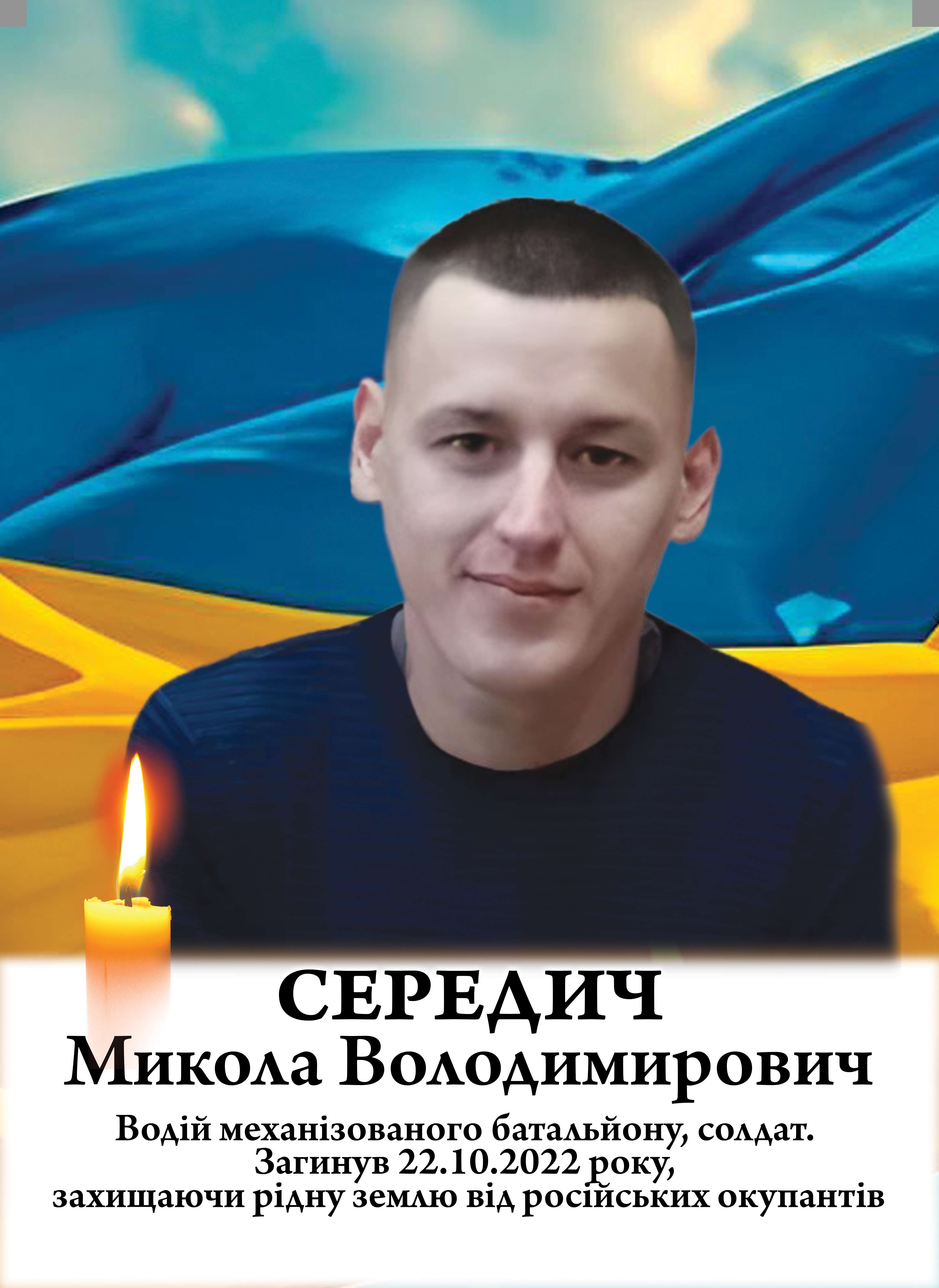 Микола Середич загинув 22 жовтня 2022 року під ворожим артилерійським обстрілом поблизу населеного пункту Кліщіївка, що на Донеччині, виявивши мужність, стійкість та відданість присязі. Воїну було 32 роки, в нього залишилися дружина, донька.